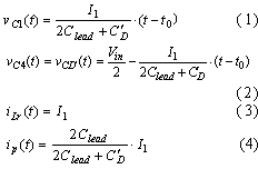 ,由于DR1和DR2都导通,变压器副边和原边电压均为零, vAB全部加在Lr上。因此在这段时间里,Lr和C2、C3谐振工作,iLr和C2、C3的电压分别为: