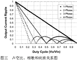 图一为两相交错Buck拓扑,其每相都有一个自己的输其纹波出电感。消除作用如图二所示。其两相作用的结果使输出电流的实际纹波频率为每相开关频率的两倍,而纹波大大小于每相电流的纹波。按照图三给出的占空比、相数、纹波的关系,当占空比为0.5时纹波完全消除。