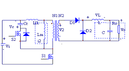 fig3. The circuit operation in state 1 主开关S1在t0时刻导通,钳位开关S2断开,变压器初级线圈受到输入电压Vi作用,励磁电流线性增加,初级侧流过电流i1。二次侧D1导通,D2截止,电感电流 流经二次侧,功率通过变压器传输到二次侧。