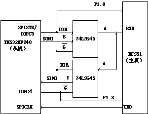 在利用SPI接口实现DSP与单片机进行串口通讯的时候,由于DSP需要通过一根时钟引线连接主机从机使其同步,而MCS51单片机串行通讯只有RXD和TXD,TXD产生系钟,RXD则既接收数据又发送数据,这里我们选用两片74LS645(同步收发器)来区分收发数据。硬件电路图如下: