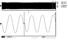 图6逆变软启动输出波形 图7逆变器输出切换至电子旁路输出