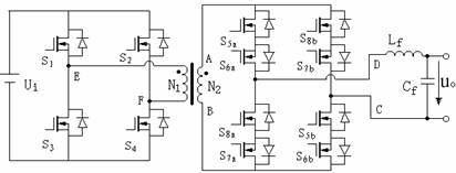 (2)采用移相控制策略,双向高频环节逆变器实现了周波变换器的零电压开关(ZVS)、输出滤波器前端电压为单极性SPWM波、输出滤波器体积重量小、输出波形质量高等优点。