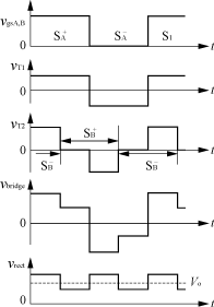 为了克服滞后桥臂实现零电压开关难的问题,同时又不会引起占空比的丢失和开通损耗的增大,文献提出了一种在滞后桥臂并联一个谐振电感和两个谐振开关的拓扑结构,如图2所示。开关的控制策略如图3所示。本拓扑在半个周期内有6个工作模态。
