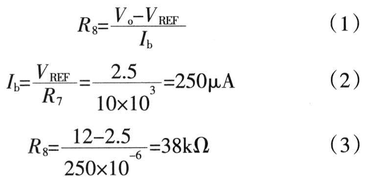 反馈电路采用精密稳压源TL431和线性光耦PC817。利用TL43l可调式精密稳压器构成误差电压放大器,再通过线性光耦对输出进行精确的调整。如图2所示,R4、R5是精密稳压源的外接控制电阻,它们决定输出电压的高低,和TL431一并组成外部误差放大器。当输出电压升高时,取样电压VR7也随之升高,设定电压大于基准电压(TL431的基准电压为2.5V),使TL431内的误差放大器的输出电压升高,致使片内驱动三极管的输出电压降低,也使输出电压Vo下降,最后Vo趋于稳定;反之,输出电压下降引起设置电压下降,当输出电压低于设置电压时,误差放大器的输出电压下降,片内的驱动三极管的输出电压升高,最终使得UC3842的脚1的补偿输入电流随之变化,促使片内对PWM比较器进行调节,改变占空比,达到稳压的目的。R7、R8的阻值是这样计算的:先固定R7的阻值,再计算R8的阻值,即