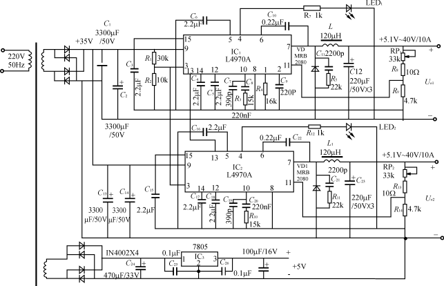 由于开关稳压电源具有体积小、重量轻、高效节能、输入电压范围宽、适应范围广、保护功能全等特点,已广泛应用于电子产品的各个领域。在此给出一种基于L4970A芯片实现的具有双路10A输出的电压可调型开关稳压电源。