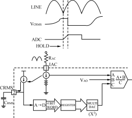 当半个周期结束时,CRMS脚上的电压仍保持同步,并变换成一个4bit字节,以便在ACU中进一步处理。在下半个周期里,CRMS脚则进行放电,并准备积分。这一方法的优点是VRMS信号上的二次谐波脉动实际上已被消除了。若想用常规的双极点滤波器来限定衰减,则二次谐波脉动是无法避免的,并且在输入电流信号中还会引起三次谐波失真。另外,对电网输入变化的动态响应也有改进,因为每个周期都会产生一个新的VRMS信号。