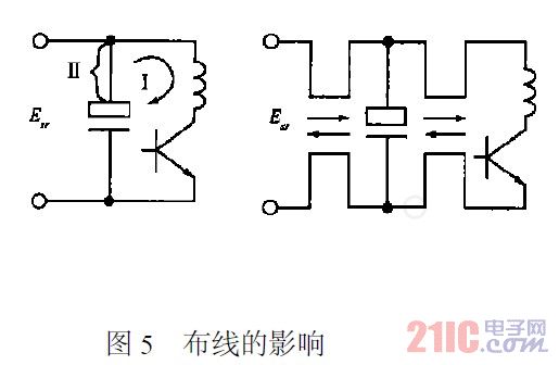 流过开关大电流的导线应尽量短,并且不跟其它线交连。降压型开关稳压电源的续流二极管或者升压型的开关三极管的接地端应以最短的引线直接与输出电容的地端相连。图5表示了布线的影响,尖峰干扰通过环路I辐射,故构成这一环路的各段连线的感性耦合必须最小,电容器的引线要短,以减小引线电感。