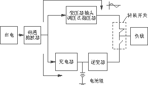 当市电供电不正常时如图2所示,连接电网的转换开关关断,连接逆变器的转换开关开通,逆变器在蓄电池组所提供的直流能源支持下,向用户提供50Hz、220V正弦波交流稳压电源,同时充电器停止工作。