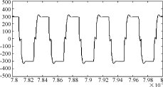 本文利用MATLAB6.1提供的SIMULINK工具包对整个系统建立了仿真模型进行仿真。仿真模型参数:输入直流电压300V,输出交流电压220V,25Hz,额定容量1000VA,开关频率25kHz,变压器变比1/1.4,输出滤波电感L=0.5 mH,输出滤波电容C=20μ F,额定负载R=45Ω。仿真波形如图5所示 。