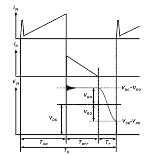 图2所示为开关管工作波形,其电压为VDSnom=VDCmax+VRO。开关MOSFET的耐压被用来决定反激电压VRO的值,在其不变的前提下,反激电压设置得越高越好。需要说的是,反激电压是由开关变压器的原、副边匝数比和输出电压来决定的,它是一个不随输入电压变化的量。