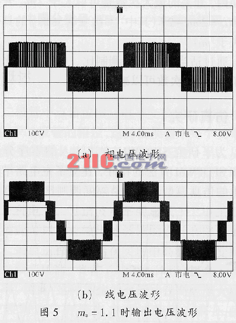 为了研究SFOPWM方法注入的零序分量特点和SFOPWM方法的特性,建立了主电路结构同图1的仿真模型。图3是幅度调制比ma=0.9和1.1时候的调制波和注入的零序分量。从图3可以看出,SFOPWM方法的调制波是3次三角波,其幅值与调制比ma有关系。图4是开关频率fc=10kHz时输出的相电压、线电压波形。