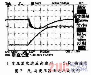 R1实际值很小,可以忽略。稳压二极管并联在D1,C1两端,它的电压是D1和C1两端电压之和。稳压二极管是随电流大小自动调整的“可变”电阻。通过改变电阻来控制上升沿和下降沿的速率,从而达到控制过冲尖峰的大小。实测Rg与驱动变压器次边反向波形如图7所示。Rg上电压波形即为励磁电感上流过的电流波形。正脉冲下降沿的过冲尖峰由励磁电感造成的: