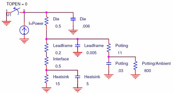 该模型以左上角一个电流源作为开始,其为系统增加热量的模拟。电流流入裸片的热容及其热阻。热量从裸片流入引线框和封装灌封材料。流经引线框的热量再流入封装和散热片之间的接触面。热量从散热片流入热环境中。遍及整个网络的电压代表高于环境的温升。
