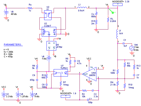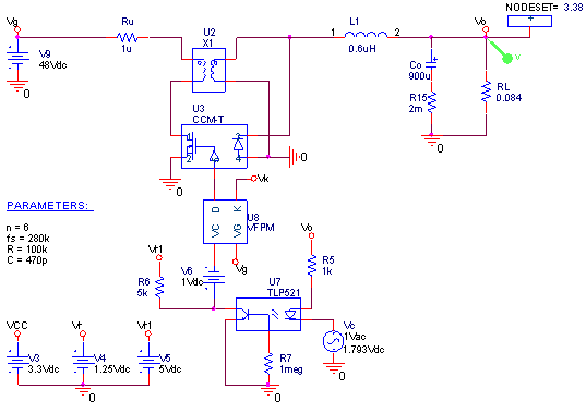 第一步:去掉补偿网络,对控制电压Vc(即补偿网络的输出)进行直流扫描,找到使Vo=3.3V时的Vc值,将Vc的直流分量设为次值,即设置了电路的静态工作点。